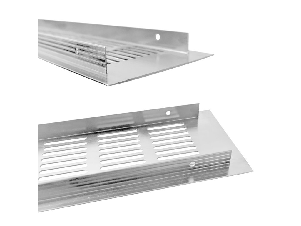 Hliníková odvětrávací mřížka (stříbrná) vhodná jako propust nad topná tělesa či jako výdech klimatizace. Použít lze také jako průchodka do dveří pro odvětrání pracoven, spíží, kuchyní, sklepních a jiných prostor.