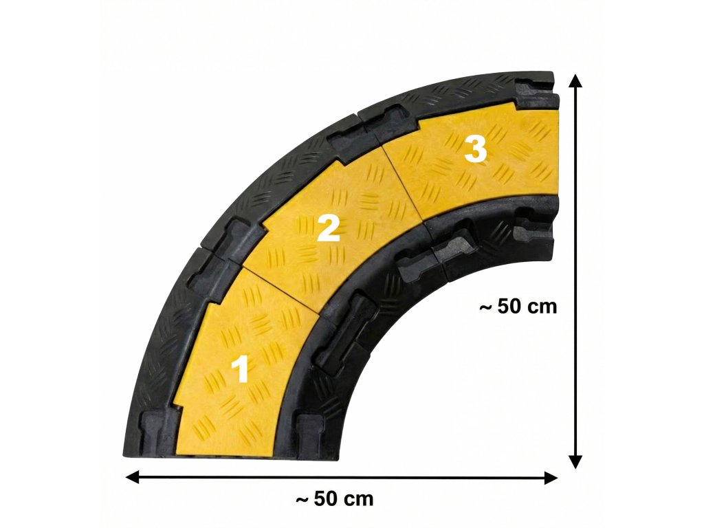 Zahnutý profil přejezdu ohýbá úhel kabelů o 30° a tedy pro dosažení pravého úhlu je zapotřebí použít 3 kusy oblouku.