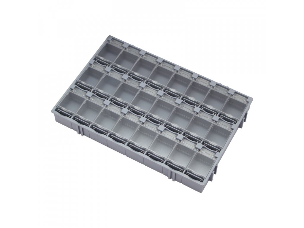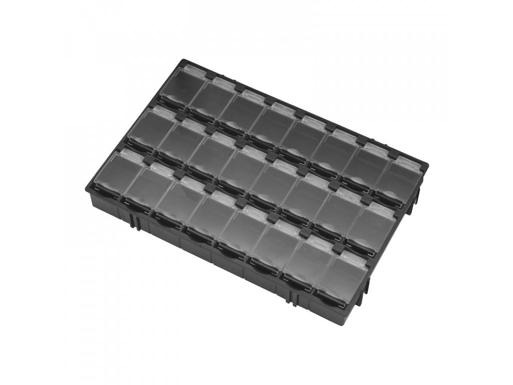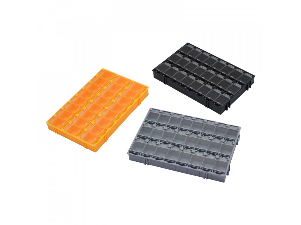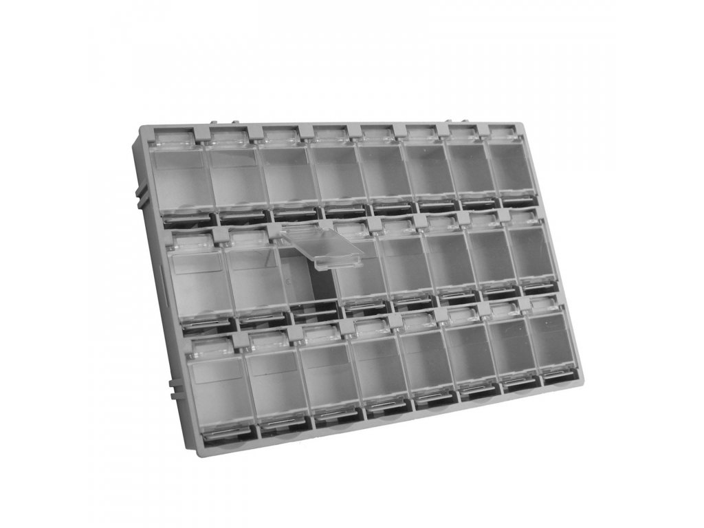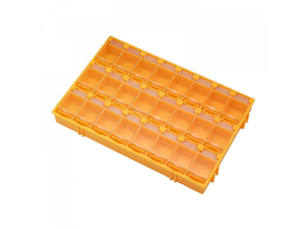 Organizátor součástek skládající se z bloku 24 kontejnerů v celku (jeden výlisek). SMD / SMT úložný zásobník s průhledným víkem na výběr v oranžové, černé a šedivé barvě.