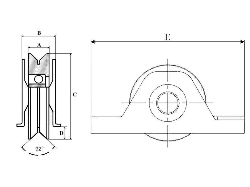 Spodní pojezdová kladka s kuličkovým ložiskem vyrobena z oceli o průměru 50 / 60 / 70 / 80 / 90 / 100 / 120 / 140 mm s drážkou typu Y pro těžké kolejnicové brány.